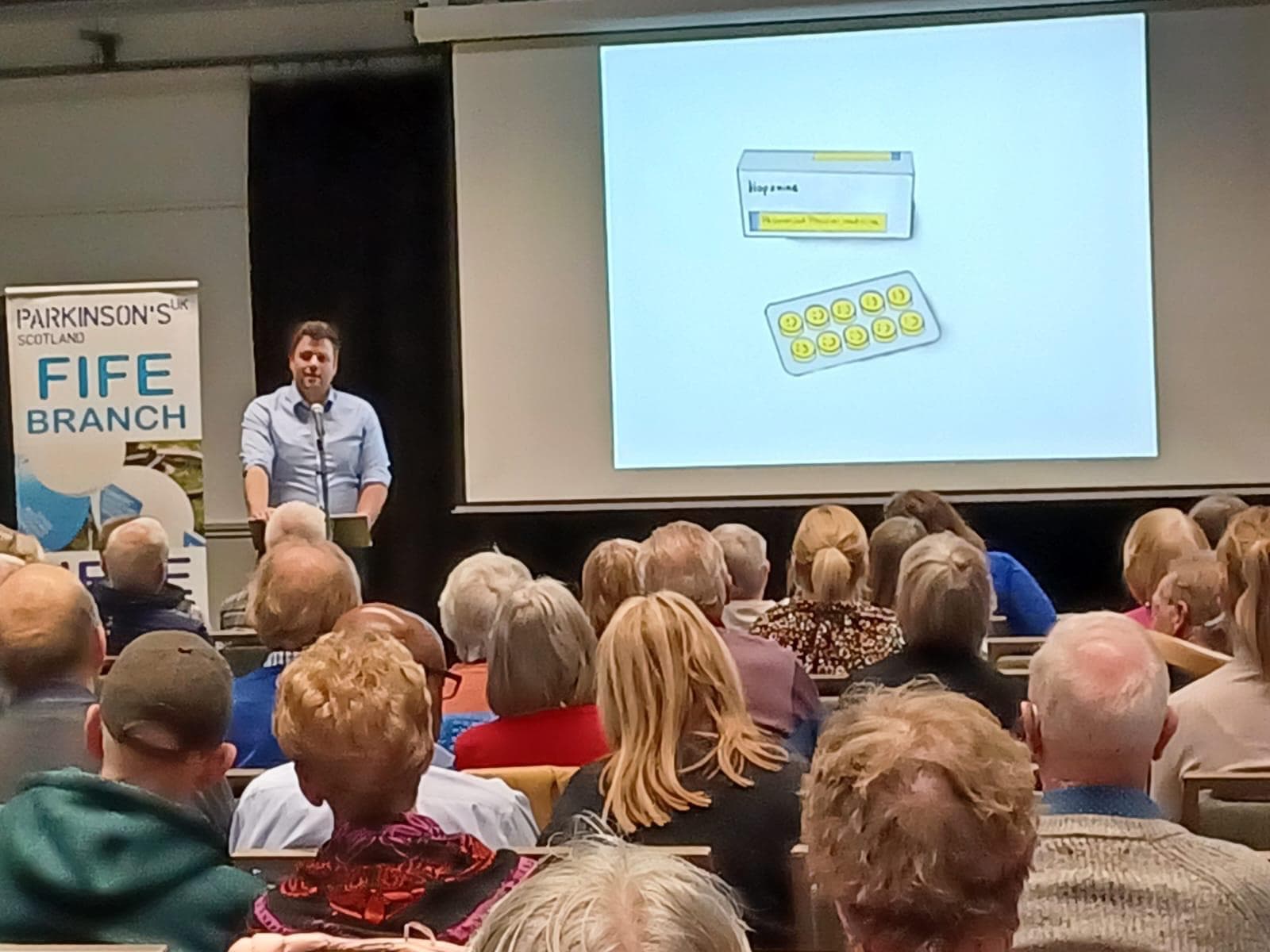 The talk on the 10th April by Dr James Woods, Gillian Aldrich and some of the NHS team in Fife, supported by Parkinson's staff and a representative from Fife Sport and Leisure Trust was hailed by all to have been a great success.